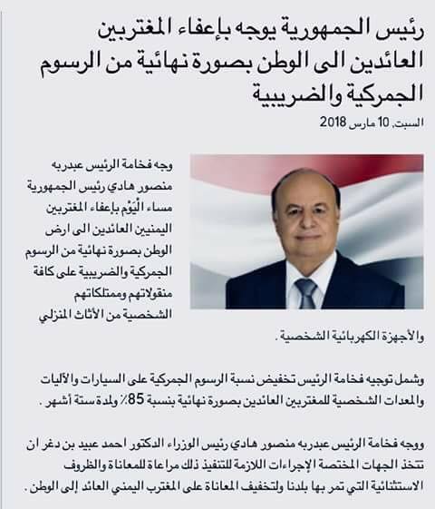 حيث وجه الرئيس اليمني عبد ربه منصور هادي مساء اليوم بإعفاء المغتربين اليمنيين العائدين الى ارض الوطن بصورة نهائية من الرسوم الجمركية والضريبية على كافة منقولاتهم وممتلكاتهم الشخصية من الأثاث المنزلي والأجهزة الكهربائية الشخصية .