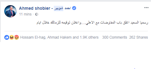 وكتب شوبير على صفحته الرسمية عبر موقع التواصل الاجتماعى “فيس بوك”، قائلاً: “رسمياً السعيد أغلق باب المفاوضات مع الأهلى.. وإعلان توقيعه للزمالك خلال أيام”.