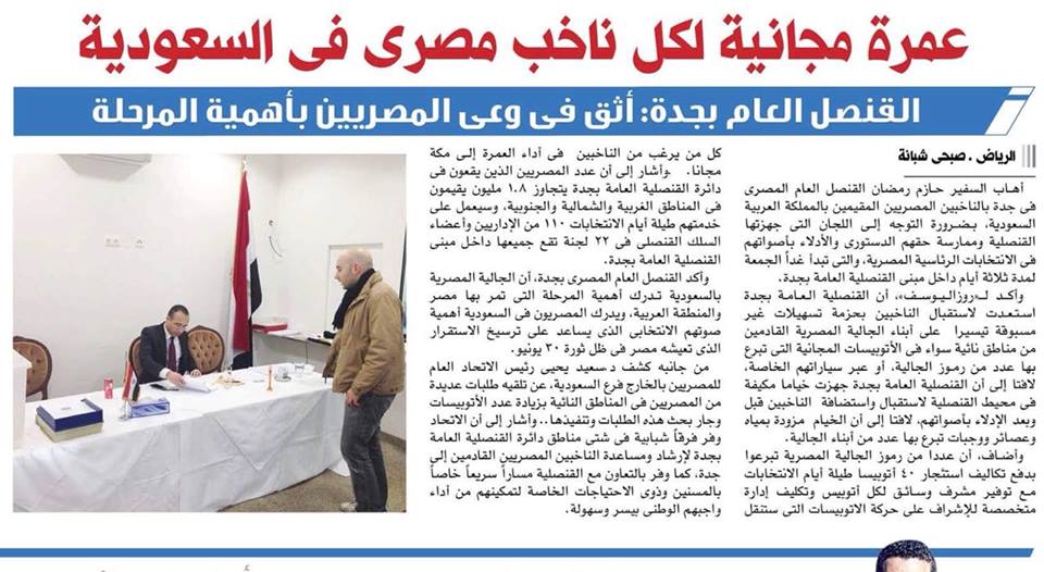 قامت صحيفة الرياض السعودية بنشر ما نشيت تؤكد فيه عمرة مجانية لكل ناخب مصرى ، والعهدة تقع بالكامل على صحيفة الرياض السعودية ، وعلى وزارة الخارجية المصرية الرد على ذلك