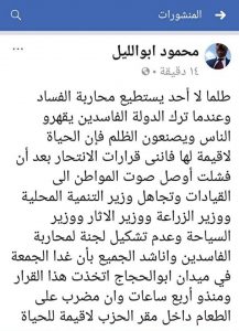 وقال أبوالليل انه حاول توصيل صوت المواطنين لرئاسة الجمهورية ورئاسة مجلس الوزراء وارسال اكثر من 46 تلغراف لبعض الجهات المعنية فى بعض قضايا الفساد ولكنه فشل فى ذالك ولهذا قرر الانتحار غدا فى ساحة سيدى ابوالحجاج أمام المواطنين .