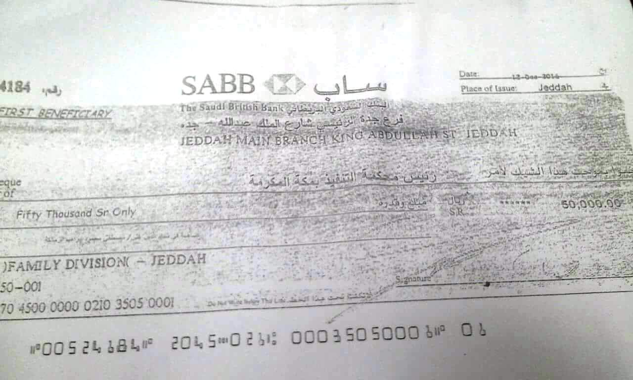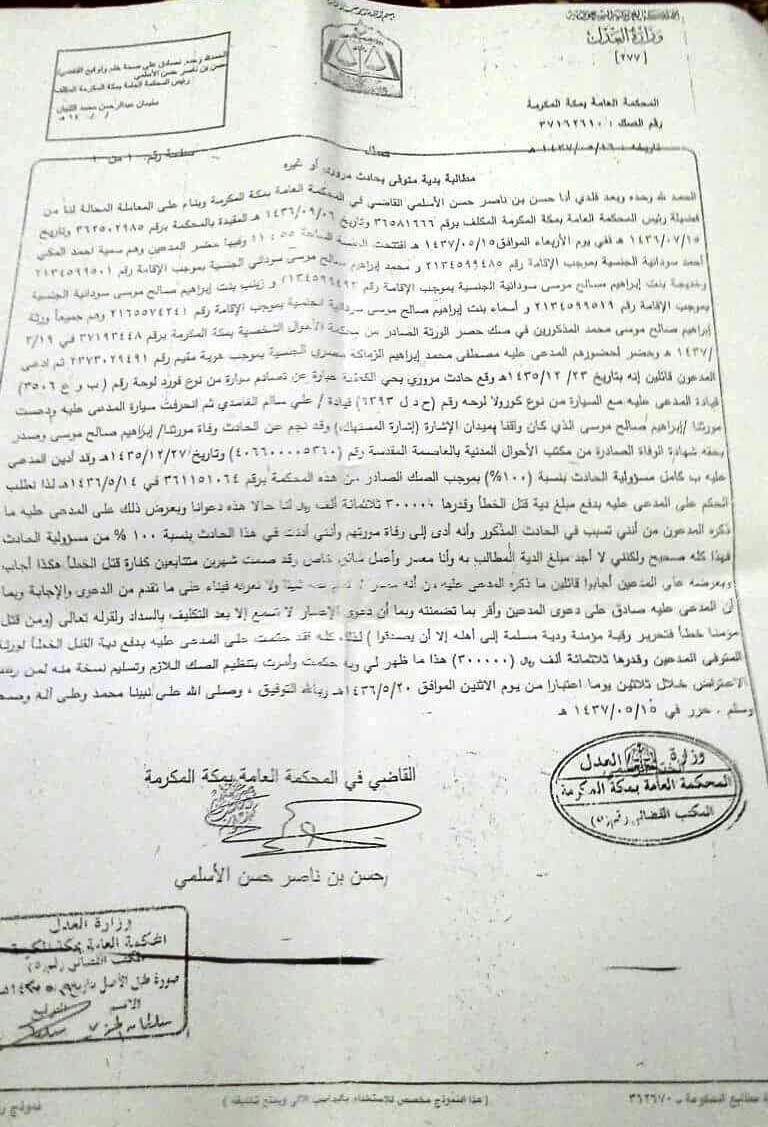 ناشدت زوجة مصطفى إبراهيم عبد الله احد المصريين بالسعودية ويعمل سائق أبناء الجالية المصرية بالسعودية بالتدخل لإنقاذ زوجها المتهم بقتل مواطن بطريق الخطأ بمساعدته فى دفع الدية المقدرة ب 300 ألف ريال تم دفع 120 ألف ريال منها ومتبقى 180 ألف ريال