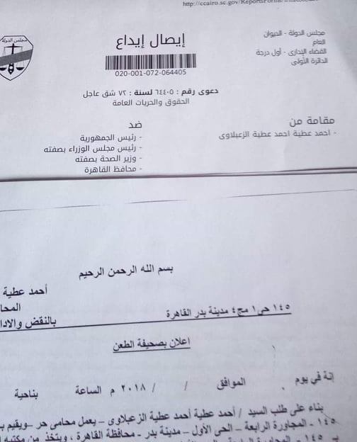 قام اجمد الزعبلاوي المحامى برفع دعوة قضائية تحمل رقم 644 الدعوي رقم 64405 لسنة 72