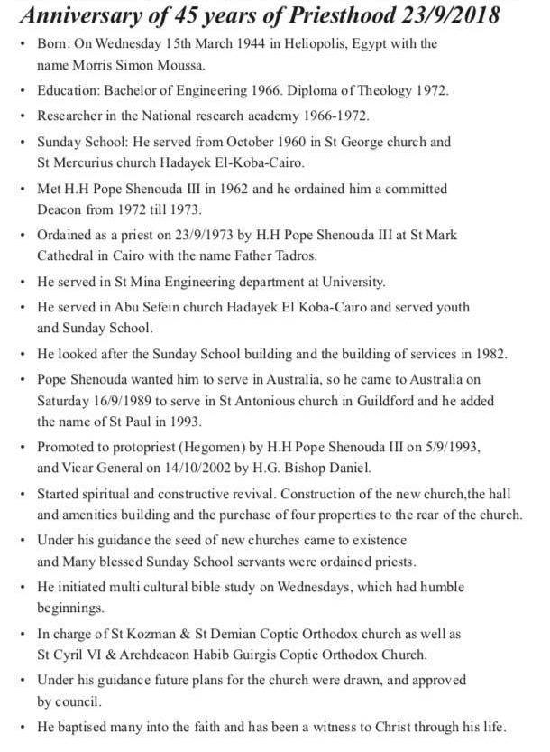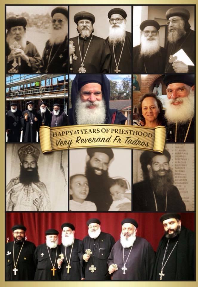 شهد صباح اليوم الأحد ٢٣ سبتمبر نيافة الحبر الجليل الانبا دانييل أسقف سيدنى وتوابعها احتفال شعب إيبارشية سيدنى بكنيسة القديسان العظيمان الانبا أنطونيوس والأنبا بولا بمرور ٤٥ عاماً على سيامة كاهن الكنيسة ووكيل المطرانية القمص تادرس سمعان والذى يصادف ايضاً اليوبيل الفضى لقمصيته وذلك خلال القداس الالهى حيث قدم الانبا دانييل نيابة عن شعب الايبارشية التهنئة له ولزوجته وكذلك شعب وكهنة الكنيسة بعد إنتهاء عظة القداس التى تحدث فيها عن الحياة الابدية للانسان وأهمية الصلاة والصبر فى حل المشاكل متخذاً القديس الانبا باسيليوس مثالاً الذى أخذ اكثر من ٤٠ يوم لحل مشكلة بين زوجين .
