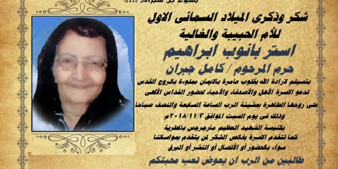 الذكرى السنوية الأولى للسيدة استر بانوب ابراهيم والدة الأستاذ عماد وتتقدم الأهرام بخالص العزاء