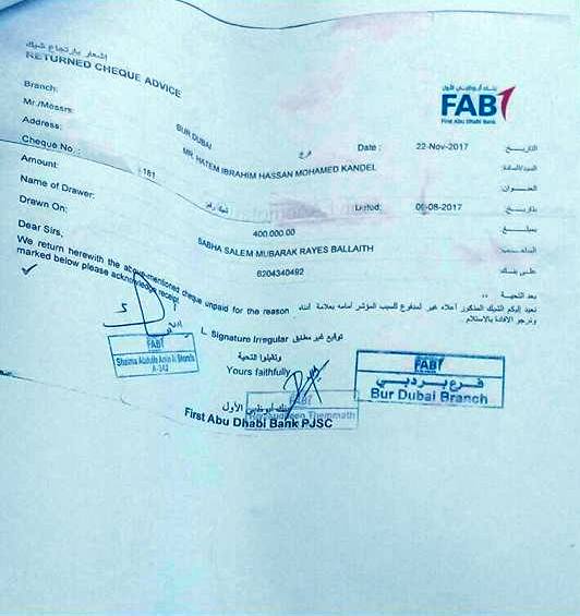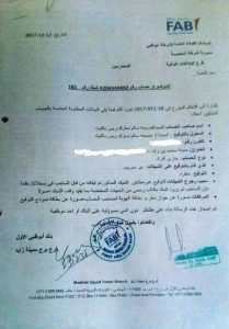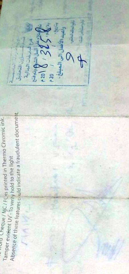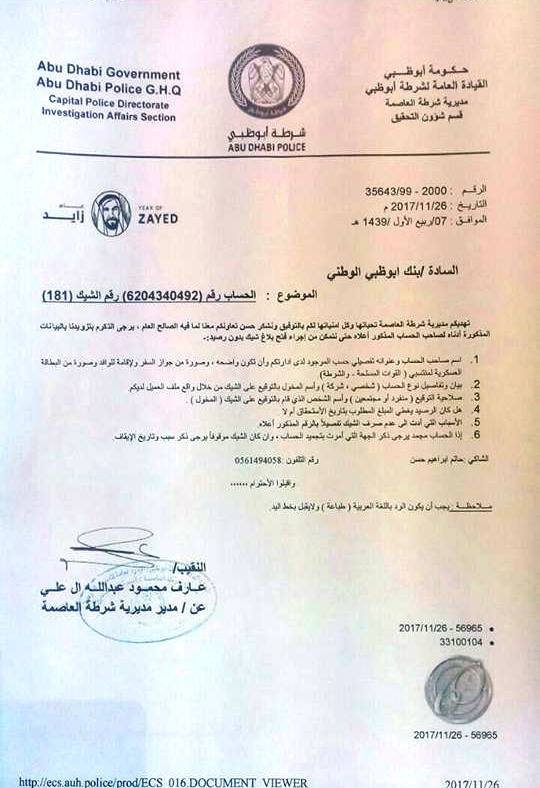 بنك ابوظبي الوطني مدينة زايد في ابوظبي اعطوني كتاب إفادة بتوقيع غير مطابق 27/11/2017وبعد ذلك أخذوا مني كتاب الافادة الذي عليه توقيع غير مطابق يوم 11/12/2017بالقوة من البنك وقالوا لي سنعطيك كتاب إفادة ثاني عليه إيقاف الشيك ورفضت اني اخذ هذا الكتاب لأن هذا الكتاب يقوم بالغاء الشيك البنكي والقصد من هذا العمل إلغاء الشيك الذي بحوزتي والرفض الاساسي الذي معي بتوقيع غير مطابق كيف لي انا اخذ رفضين فهذا يلغي لي الشيك وقاموا بالفعل ببعث الكتاب لشرطة العاصمة بأبوظبي بعد أن رفضت أنا اخذ هذا الكتاب مرفق مع هذا التظلم (كتابين إفادة 1-كتاب إفادة توقيع غير مطابق 2-كتاب إفادة توقيع غير مطابق وايقاف الشيك ايضا .