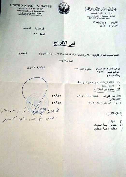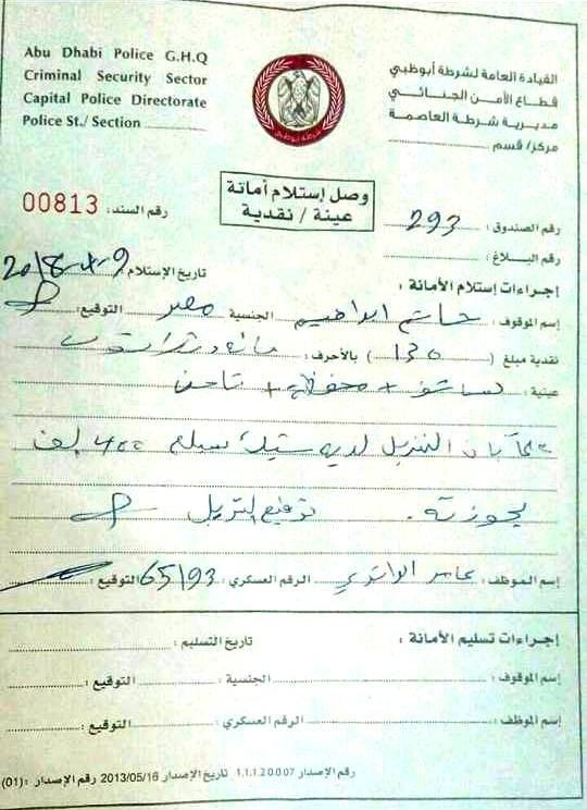 ثانيا :شرطة العاصمة قسم التحقيقات في ابوظبي بقيادة الرائد عارف محمود عبدالله آل علي قاموا بتعطيل فتح بلاغي الخاص بالشيك وكان من المفترض انا يكون فتح بلاغي يوم 11/12/2017في ظل أن معي عريضة النيابة بفتح بلاغي رسمي كانت سارية ولم تنتهي وقالوا لي في شرطة العاصمة اذهب للبنك في هذا اليوم تحديدا وقام البنك بأخذ كتاب الافادة الخاص بي وقمت بعده بتجديد عريضة النيابة يوم 8/4/2018ورفضوا أن اقوم بفتح البلاغ لأن الكتاب الثاني بتاريخ 12/12/2017 الذي بعث إليهم من البنك بتوقيع غير مطابق وايقاف الشيك وهذا يتعارض مع عريضة النيابة لأن مذكور به توقيع غير مطابق فقط في العريضة وليس إيقاف الشيك وقمت ان وكان معي صورة من كتاب الإفادة الاول بمخاطبة الرائد عارف بالعاصمة بأن معي صورة من الكتاب الاول فقام بفتح البلاغ الخاص بي بالكتاب الأول بتوقيع غير مطابق يوم 8/4/2018وقاموا بإيدعى بالسجن بالرغم من أن معى سند كفالة بحجز جواز السفر الخاص بي بشعبية أبوظبي وقاموا بحجزي يوم 8/4/2018في العاصمة بأبوظبي وبعد ذلك قاموا بترحيلي يوم 9/4/2018سوياحان للمخالفين الشهامة مدينة زايد العسكرية .وهناك تم حجزي واعطوني ايصال استلام أمانة يذكونى به بأنني معي الشيك البنكي الخاص بي بقيمة 400 الف يوم 9/4/2018وتم حجزي 9 أيام هناك من 9/4/2018الي 18/4/2018مع العلم أن معى سند كفالة بحجز جواز سفري في شعبية ابوظبي وانني علي ذمة قضية ضدي فأن شاكي ومشكو فيه .