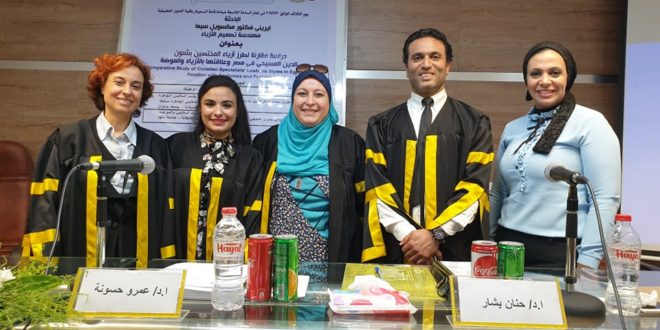 وتحدثت الدكتوره حنان حسنى يشار استاذ الملابس والنسيج وعميد كلية التربيه النوعيه بأشمون / جامعة المنوفيه ،هذه الرساله انا سعيده جداً بمناقشتها وبقول انها اضافه جديده فى مجال الملابس والنسيج واضافة لى انى اتعرف على ملابس الرتب المختلفه لرجال الدين المسيحى او المختصين بشئون الدين المسيحى بصوره حلوه انا فرحانه بالدارسه “ايرينى” جداً لانها اجتهدت واجتهادها كان فى محله انا فرحانه ان هى تعبت وراحت وناقشة وصورت بنفسها فانا فرحانه بها بكل المقاييس ربنا يوفقها وعقبال الدكتوره الرساله فى مجملها وفى مضمونها اضافه جميله جدا فى مجال الملابس والنسيج وبدعوها هى شخصياً انها تكمل فى نفس الاتجاه ممكن فى الدكتوره تأخذ هذه الزخارف وتعمل بها ملابس معاصره ويبقى يكفيها الجزء الكبير اللى عملته فى الماجستير وتكمل على هذا الجزء وان شاء الرب انا متوقعه لها مستقبل جميل كمصمم حر وتبقى اسم من الاعلام الموجوده فى مصر. وتحدثت ايضا الدكتوره منال يوسف نجيب استاذ تصميم بقسم طباعة المنسوجات و وكيل كلية الفنون التطبيقيه للدراسات العليا بجامعة بنها ،هذه الرساله هى موضوع جديد وانا شوفت فى الرساله الباحثه “ايرينى” بتلف شوارع مصر كلها من القاهره الى الاسكندريه الى اسيوط الى سوهاج علشان تجمع الداتا الخاصه بها لان الرساله هى بحث ميدانى عن ملابس الكهنوت ورجال الدين انا شوفت تعب الدارسه “ايرينى” فى الرساله وقد ايه تعبت حتى فى الجزء التطبيقى فى الرساله كان ممتاز فى تصميمتها بالفساتين اللى هى عملتها مستوحاه من الداتا اللى هى جمعتها.وقد حضر هذة المناقشة جانب كبير من الحضور المهتمين بمثل هذة الرسائل الاكاديمية ومنهم المفكر الاقتصادى ناصر عدلى محارب رئيس مجلس ادارة المواطنة نيوز