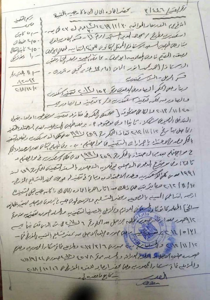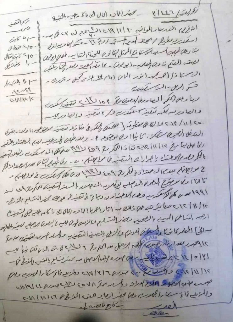 و أضاف قائلا ، أن مستشار الجمعية ع.ا استلم الأرض ١١/١٢ لعام ٢٠١٢ بمساعدة عائلات من العرباوية معروفين بسيطرتهم علي المنطقة ، و زور في ملكيه الاربعه فدادين التابعة للنقابة علي أنهم وضع يد و قام بإدخال كاحول ع.ج .