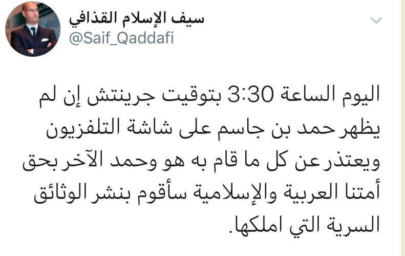 هدد سيف الإسلام القذافى حاكم قطر السابق حمد بن جاسم والد الأمير تميم بنشر وثائق سرية ضده وضد ما تفعله قطر بالأمة العربية على حد قوله ، وأنه سيتوقف عن نشر هذه الوثائق فى حالة خروج حمد بن جاسم على شاشات التلفاز والأعتذار للشعب العربى