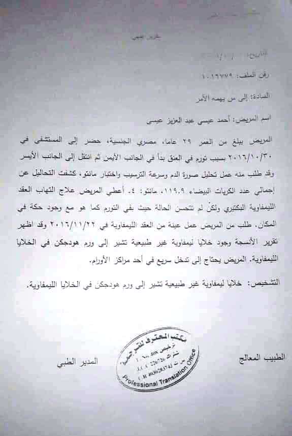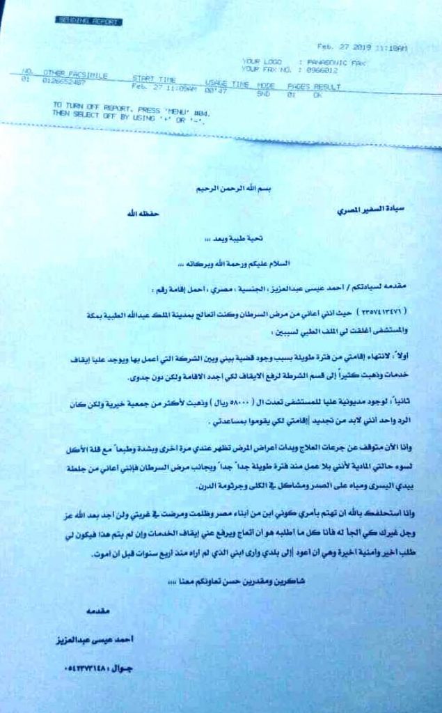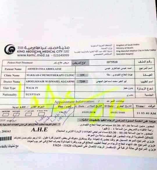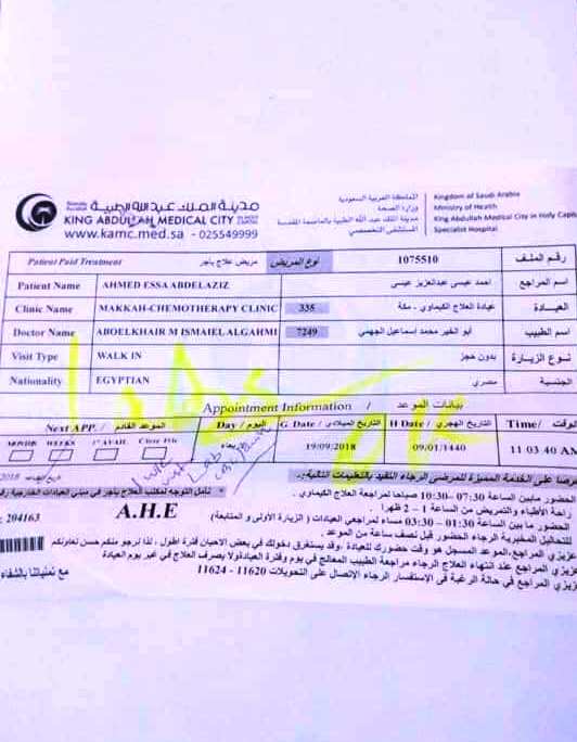 أحمد عيسى عبد العزيز مريض سرطان مصرى مقيم بجده بالسعودية منذ عامين ، كان أحمد يعالج بجرعات الكيماوى الى أن توقفت الجرعات منذ تسعة أشهر لعدد من الأسباب منها وجود قضايا عمالية بينه وبين كفيله وبناءاً عليه تم إيقاف تأمينة