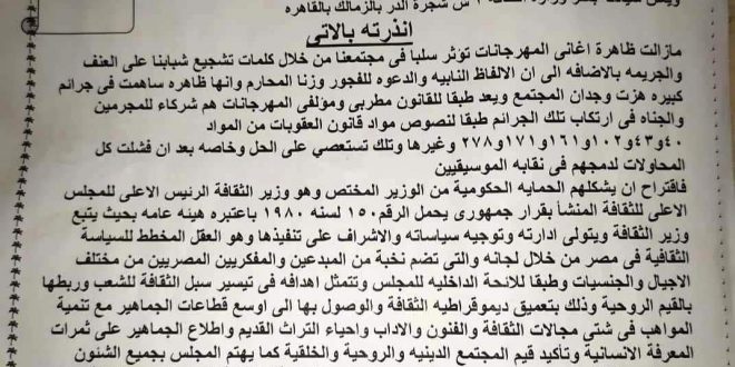 وطالب “أيمن محفوظ المحامي” في ختام إنذاره بخطاب موصى بعلم الوصول كمقدمة لدعوى قضائية بإلغاء قرار وزير الثقافة السلبي بعدم ضم مطربي المهرجانات إلى رعاية المجلس الأعلى للثقافة وفتح قصور الثقافة وتأهيلهم وإصدار تراخيص عمل لهم من وزارة الثقافة.