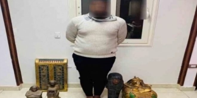 ضبطت الأجهزة الأمنية التابعة لوحدة مباحث قسم شرطة مصر القديمة بمديرية أمن القاهرة أحد الأشخاص (مقيم بدائرة القسم)، وبحوزته جوال بداخله (تابوت ذهبى اللون- 3 تماثيل مختلفة الأحجام- لوحة فرعونية ) يشتبه فى أثريتهم.