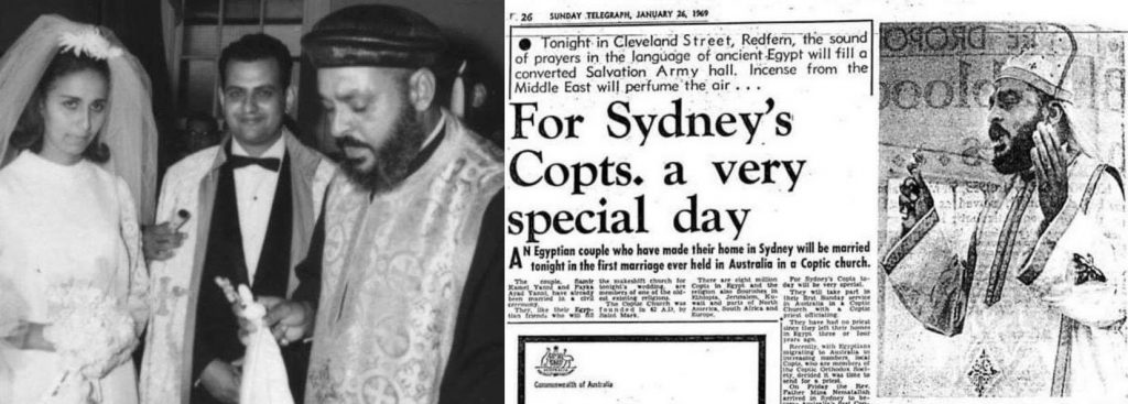 فى مثل هذا اليوم الاحد الموافق ٢٦ يناير ٢٠٢٠ بتوقيت أستراليا منذ ٥١ عام والذى يصادف ايضاً الاحد من العام ١٩٦٩ بالتزامن مع احتفالات اليوم الوطني لاستراليا نشرت جريدة صنداي تيلجراف فى مدينة سيدنى تحت عنوان ( يوم مميز جدا لأقباط سيدنى ) والذى يحتفل فيه بعقد أول زواج قبطى أرثودكسى على الاراضى الاسترالية وذلك بالقاعة المؤجرة من مؤسسة جيش الخلاص ( Salvation Army ) فى حى ريدفن باسم كنيسة القديسة العذراء , ومما يذكر ان القس مينا نعمة الله اول كاهن قبطى سيم بالقارة الاسترالية بيد مثلث الرحمات قداسة البابا كيرلس السادس , وقد وصل ميناء ملبورن البحرى فى اول محطة له بالقارة الاسترالية قادماً من القاهرة يوم ٢١ يناير ١٩٦٩ حيث صلى اول قداس الهى , ومنها الى سيدنى يوم ٢٤ يناير ليصلى اول قداس رسمى بالقاعة المؤجرة .