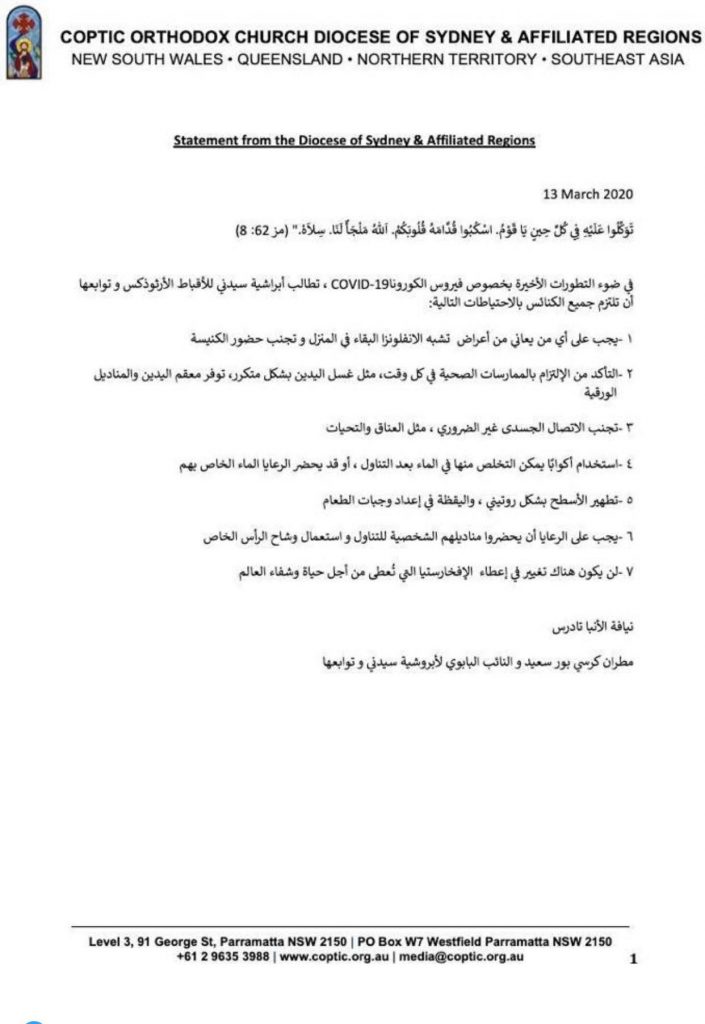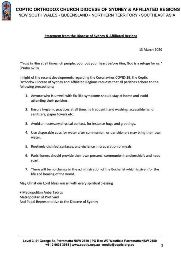 بخصوص القلق الذى يسود الشعب الأسترالي بعد ان اتخذت أستراليا عدد من الاجراءات الاحترازية والوقائية منها منع استقبال القادمين من الصين , ايران , كوريا الجنوبية وإيطاليا والسماح فقط للأستراليين دخول البلاد على ان يتبعوا تعليمات الحكومة الأسترالية , وقد أوصى الحبر الجليل شعب كنائس إيبارشية سيدنى ان يتبعوا عدد من التعليمات على النحو الاتى :