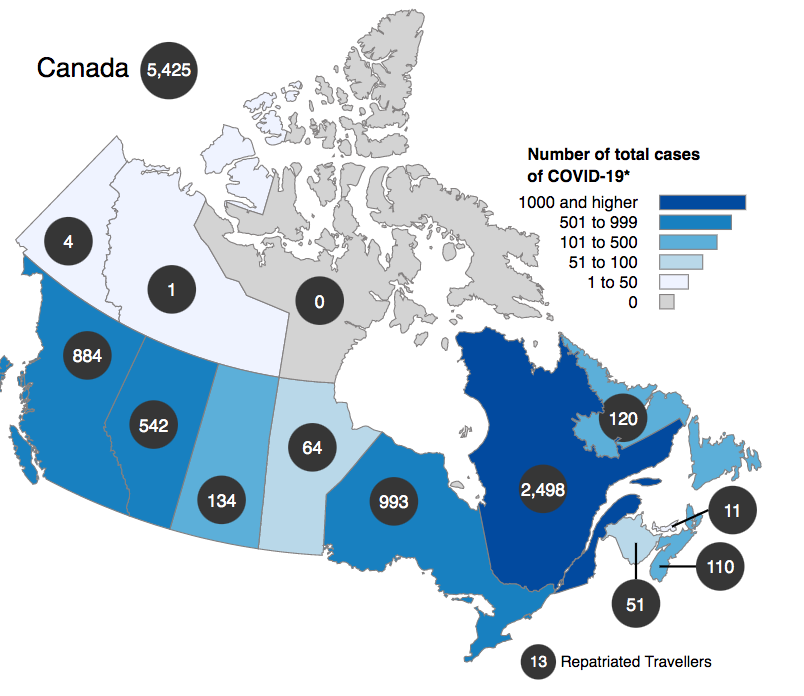 أما موقع الحكومة الفيدرالية والذي يعاني دائما من البطئ في تحديثة فقال أن عدد المصابين وصل إلي ٥٢٦٤، بينما حالات الوفاة وصلت إلي ٥٩ حالة. وأوضح موقع كندا أن عدد المصابين في أونتاريو ٩٩٣ بينما موقع أونتاريو ذكر أن عدد المصابين ١١١٧. وأشار موقع الحكومة الفيدرالية أن أعلي معدلات الإصابات في كيبك حيث وصلت الإصابات في كيبيك ٢٤٤٩. وبريتش كلومبيا ٨٨٤ حالة إصابة.