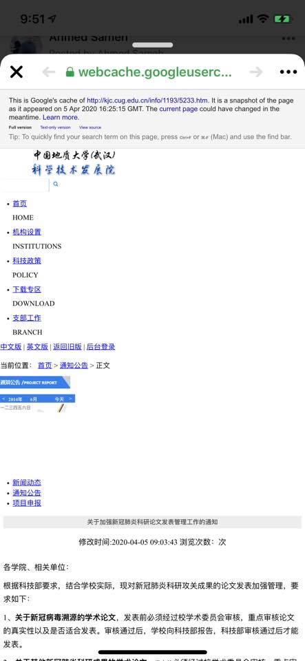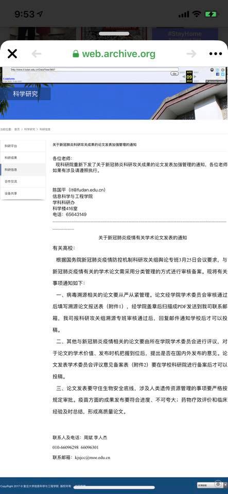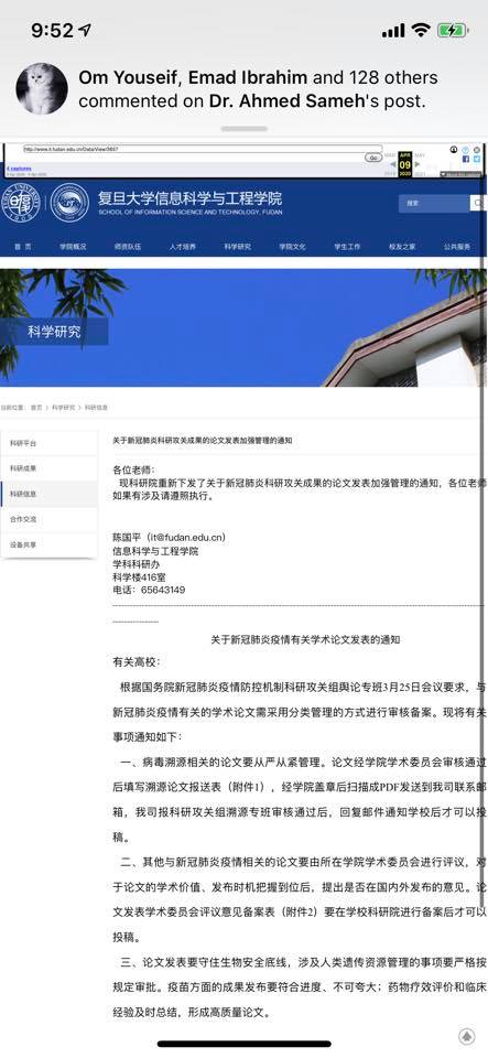 الغريب فى الأمر أن موقع جامعة فودان وجامعة الصين للعلوم الجيوعلمية في ووهان نشر بحثين فتم رفعهم ونفس المنع حدث في مقال نشرته جامعة فودان في ٩ ابريل من ٣ أيام وتم رفعه مباشرة