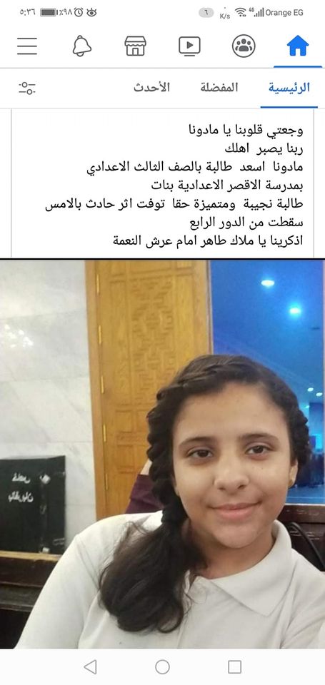 ليلة حزينة عاشتها أبناء الأقصر بعد وفاة الطفلة مادونا أسعد الطالبة بالصف الثالث الإعدادى والمنتقلة من مدرسة أم النور الأبتدائية خالص التعازى للأسرة الكريمة ولأهالى الأقصر من مؤسسة الأهرام الكندي