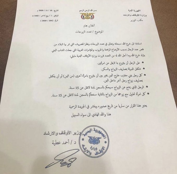 كما انتشر مؤخرا على مواقع التواصل الاجتماعي خبرا عن اتخاذ السلطات اليمنية قرارا بفرض تعدد الزوجات بداعي “نقص عدد الرجال” في ظل النزاع الدائر في البلاد، على أن يُعاقب المخالفون بالسجن، ما أثار جدلا واسعا بين نشطاء الإنترنت في الوطن العربي.