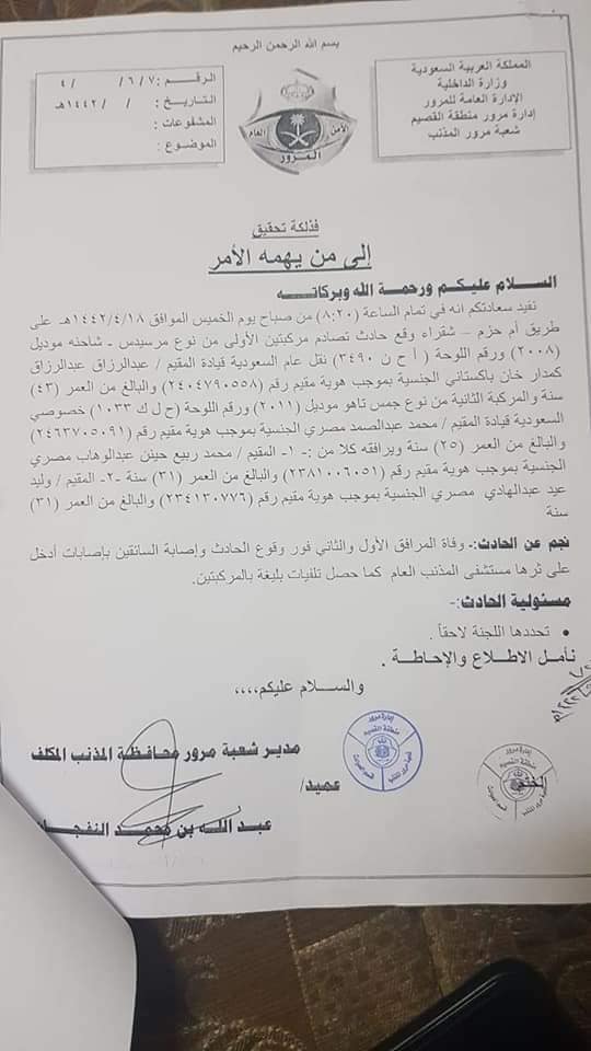 وقال هيثم سعد الدين المتحدث الرسمي والمستشار الإعلامي لوزارة القوى العاملة: إن الوزير تلقى تقريرا عاجلا من الملحق العمالي أحمد رجائي رئيس المكتب العمالي بالرياض، أوضح فيه تفاصيل الحادث الذي لقي فيه اثنين من العاملين المصريين بالسعودية حتفهم وأصيب آخر بينما كانوا عائدين من قضاء الإجازة السنوية بمصر مستقلين سيارتهم الخاصة وقبيل وصولهم الرياض وخلال مرورهم بمحافظة المذنب قامت سيارة نقل ثقيل يقودها باكستاني بقطع الطريق عليهم مما تسبب فى وفاة العامل وليد عيد سيد عبدالهادى البالغ من العمر ٣١عاماً، والعامل محمد ربيع حسن عبدالوهاب ٣١عاماً.