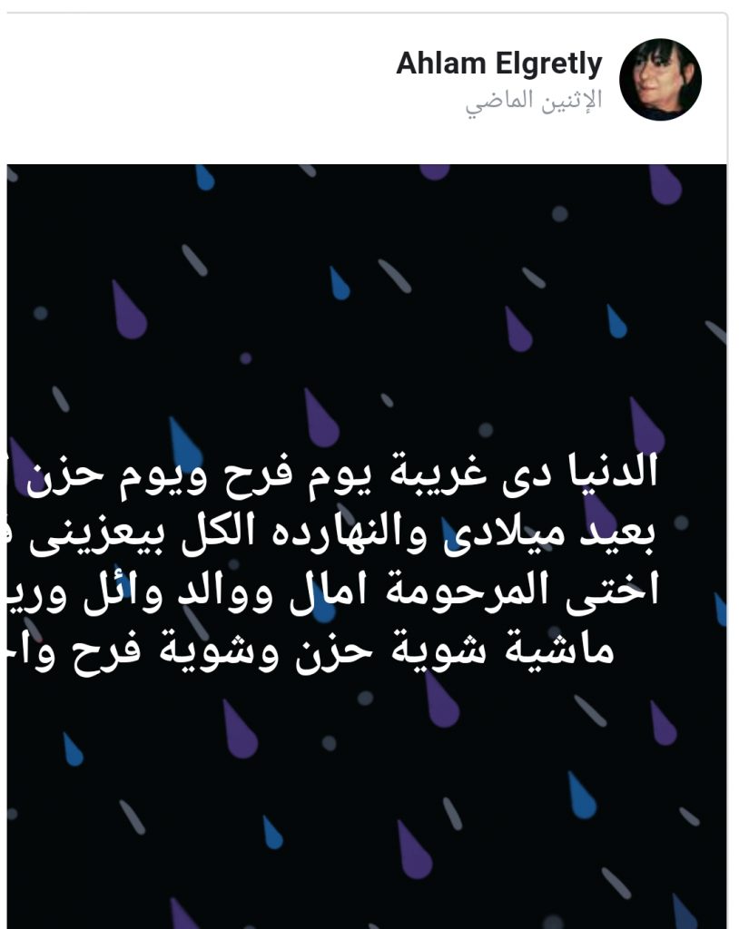 الفنانة الراحلة أحلام الجريتلى كانت في آخر منشوراتها على صفحتها الشخصية على موقع التواصل الاجتماعي “فيسبوك” قبل وفاتها، قالت الفنانة أحلام الجريتلي: «الدنيا دي غريبة يوم فرح ويوم حزن.