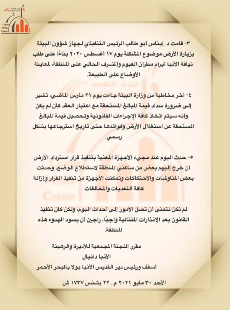 ٣- قامت د. إيناس أبو طالب الرئيس التنفيذي لجهاز شئون البيئة بزيارة الأرض موضوع المشكلة يوم ١٧ أغسطس ٢٠٢٠ بناء على طلب نيافة الأنبا أبرآم مطران الفيوم والمشرف الحالي على المنطقة، لمعاينة الأوضاع على الطبيعة.