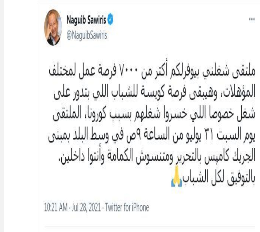 وقال نجيب ساويرس في تغريدة على «تويتر»، الملتقى هيبقى فرصة كويسة للشباب اللي بتدور على شغل خصوصا اللي خسروا شغلهم بسبب كورونا، الملتقى يوم السبت ٣١ يوليو من الساعة ٩ صباحا في وسط البلد بمبنى الجريك كامپس بالتحرير ومتنسوش الكمامة وأنتوا داخلين، بالتوفيق لكل الشباب Folded hands، رابط الملتقى https://www.shaghalni.com/.