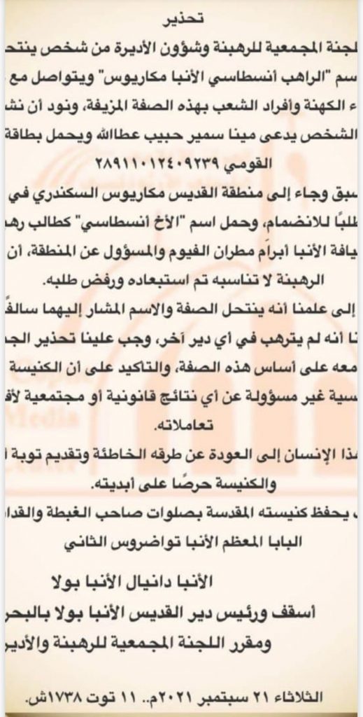 حذر دير الأنبا بولا بالبحر الأحمر واللجنة المجمعية للرهبنة وشؤون الأديرة، من شخص ينتحل صفة راهب باسم “الراهب انسطاسي الأنبا مكاريوس” ويتواصل مع كثيرين من الآباء الكهنة وأفراد الشعب بهذه الصفة المزيفة.
