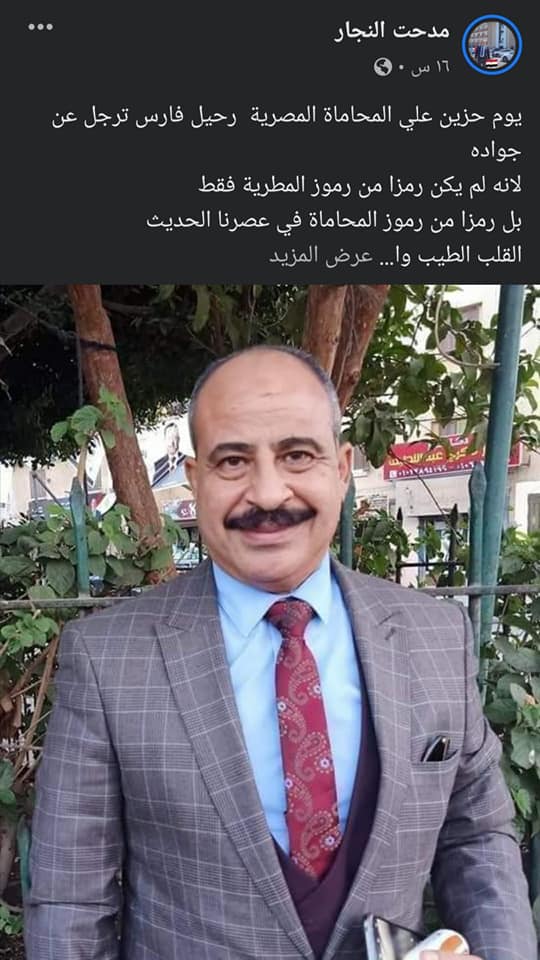 المحامي الكبير مدحت النجار 48 سنه ابن مركز ديروط محافظة أسيوط والمقيم بالجيزة فيصل الجميع يشهد لك باخلاقك ومواقفك النبيله مع المسيح ذاك أفضل جدا الرب يعطي عزاء لكل افراد الاسرة ولجميع محبيك