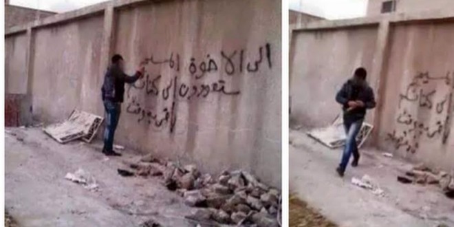تتداول مواقع التواصل الاجتماعية الفيس بوك صورة لشاب مسلم كتب رسالة الى المسيحيين على أحد الجدران في الموصل.
