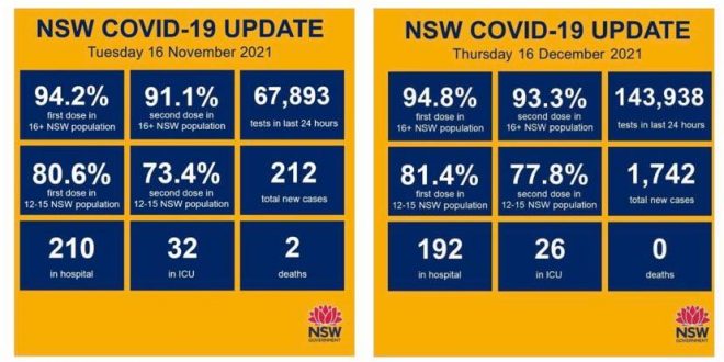 وقد سجلت الولاية اليوم الموافق ١٦ ديسمبر ١٧٤٢ حالة ، فى حين سجلت الولاية ٢١٢ حالة فى مثل هذا اليوم من الشهر الماضى . و تقول السلطات الصحية بالولاية ان الزيادة فى أعداد الإصابات الجديدة ربما يرجع الى المتحور الجديد للفيروس ” أوميكرون ” ، كما قدمت السلطات النصيحة للمواطنين بتحمل المسؤولية بأيديهم للبقاء في أمان ، مثل وضع الكمامات في الداخل ، والحصول على جرعات معززة من اللقاح , وقد صرح السيد دومينيك بيروتيت ، رئيس وزراء ولاية نيو ساوث ويلز بان الاصابات ستزاد اليوم وغدا وستستمر بالازدياد ،وعلينا التعايش مع الاصابات .