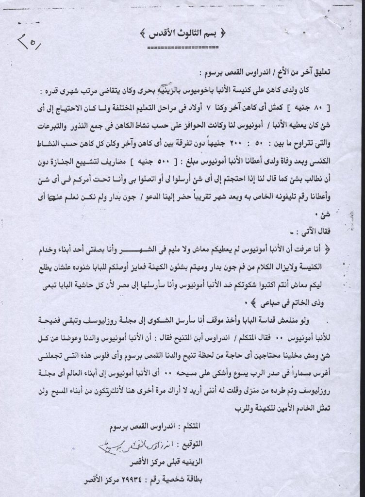 هذه التفاصيل لكاهن قام بتقديم شكوى ضد نيافة الأنبا أمونيوس يتهمه فيها أنه لا يعطى أموال للكهنة