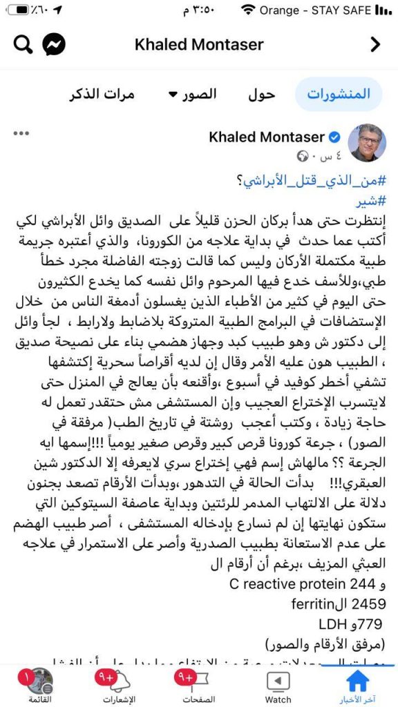 إن الأحداث تتلاحق وتتطور حول الأسباب الحقيقية التي تسببت في وفاة الإعلامي الكبير وائل الابراشي، وبعد التصريحات الجريئة لزوجته سحر الابراشي والتي قالت خلالها ان زوجها مات بسبب خطأ طبي وخروج نقابة الاطباء ببيان ناري تنفي وجود أي أخطاء وتهدد بالتقدم ببلاغات للنائب العام لكشف براءة الاطباء من الخطأ الطبي الا ان الشهادة التي صدرت اليوم من الطبيب والاعلامي الشهير والدكتور خالد منتصر تكشف تفاصيل وخيوط جديدة ربما تجعل قضية وفاة وائل الابراشي هي القضية الابرز والاكثر تداولا خلال الساعات القليلة القادمة .