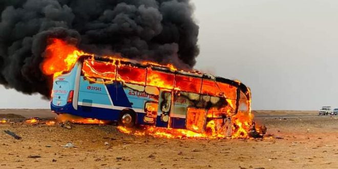 مع سيارة أخرى مما أدى إلى اشتعال النيران فى الأتوبيس، وذلك بالكيلو 43 طريق أسوان أبو سمبل السياحي.