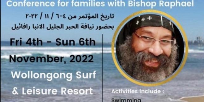 أعلنت إيبارشية سيدنى وتوابعها بأستراليا مساء الخميس الموافق ٢٥ أغسطس ، عن لقاء نيافة الحبر الجليل الأنبا رافائيل ، الأسقف العام لكنائس وسط القاهرة بالأسر الناطقة باللغة العربية ، فى مؤتمر روحى بحضور عدد من كهنة إيبارشية سيدني ، فى الفترة من يوم الجمعة ٤ نوفمبر الى يوم الأحد ٦ نوفمبر المقبل ، وسوف يتضمن المؤتمر عدد من المحاضرات والأنشطة الروحية والرياضية وذلك فى مدينة ولونجونج الساحلية جنوب مدينة سيدنى عاصمة نيو ساوث ويلز .