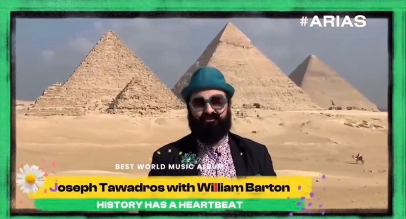 أحتفل مساء أمس الأول الخميس الموافق ٢٤ نوفمبر ، من أمام أهرامات الجيزة ، أسطورة العود الأسترالى ذو الأصول المصرية ، الموسيقار جوزيف تواضروس باستلام جائزة أفضل ألبوم موسيقى بعنوان ( تاريخ له نبضات قلب ) لعام ٢٠٢٢ عبر الفيديو كونفرانس وذلك فى الحفل الذي أقيم بأستراليا ، وقد أناب تواضروس أخيه جيمس تواضروس عازف الإيقاع لاستلام الجائزة .