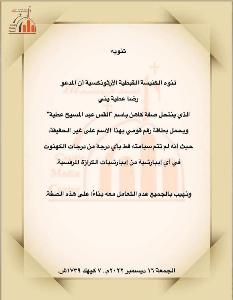 حيث نشرت الكنيسة بيان أكدت فيه بأن المدعو رضا عطية بنى الذى ينتحل صفة كاهن باسم القس