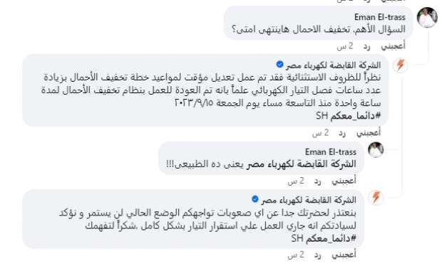 وردت الشركة القابضة على تساؤلات و الشكاوى بالاعتذار عبر صفحتها الرسمية من خلال موقع “فيسبوك” فيما يتعلق بخطة تخفيف الأحمال زذكرت نصا:” نعتذر عن أي صعوبات تواجهكم، الوضع الحالي لن يستمر، ونؤكد أنه جاري العمل على استقرار التيار بشكل كامل، شكرا لتفهمك”.