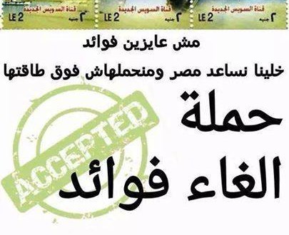 قام النشطاء بتدشين حملة كبرى لألغاء الفوائد على شهادات الاستثمار فى قناة السويس من أجل المساهمة فى تنمية وتطوير مصر.. لاقت الحملة تأييد جميع النشطاء ولاقت رفض وعدم قبول المودعين .