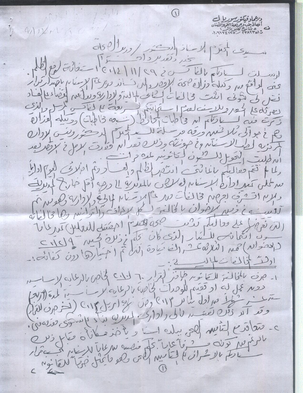أرسل الدكتور عماد فيكتور سوريال استغاثة الى وزير الصحة أكد فيها الأتى