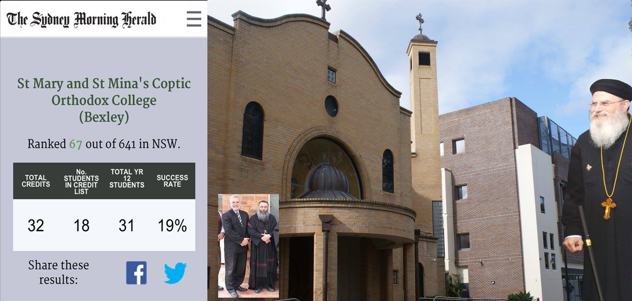 احتلت مدرسة العذراء و مارمينا المركز67 فيما احتلت مدرسة القديس مرقس المركز ١١٢ للتفوق العلمى على مدارس ولاية نيو ساوث ويلز البالغ عددهم 641 .
