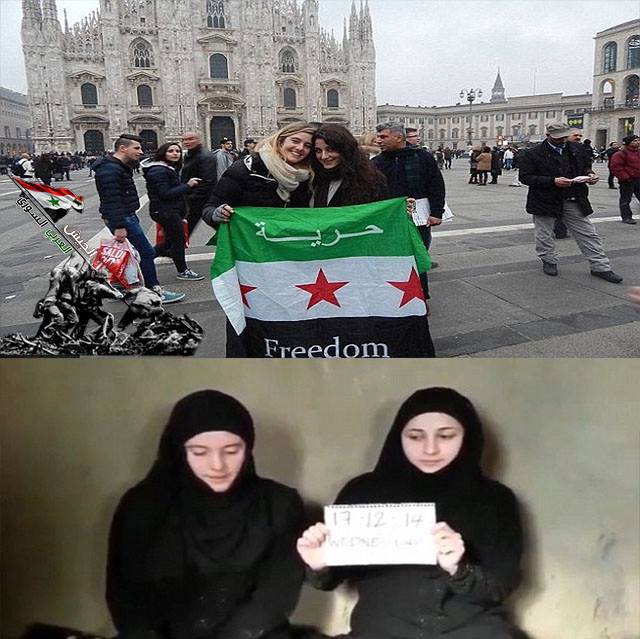 تداول النشطاء العرب صورة لفتاتان إيطاليتان كانوا يطالبون بالحرية والديمقراطية ومساعدة داعش فى سوريا ، وحينما جاءوا وانضموا الى داعش رسميا تم أغتصابهم واختطافهم وأصبحوا يستغيثون الان بحكومتهم من أجل التخلص من داعش والعودة الى بلادهم .