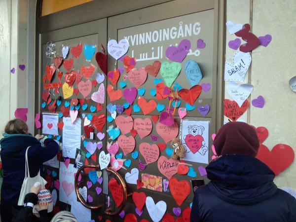 الاهم من ذلك كله ان الناس فى السويد خرجوا الى المسجد اللى اتحرق بابه وحاولوا يعتذروا للمسلمين عن الاحداث اللى حصلت ووضعوا الورد ولصقوا القلوب على باب المسجد وكمان الناس سجلت الاعتذرات مع عبارات الحب على فكرة فى السويد مفيش خانة للديانة ، علق النشطاء قائلين احنا ملناش دعوة باللى بيحصل بكوكب السويد خالين فى كوكبنا