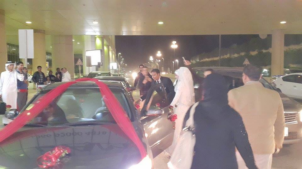 ألقى أبناء الجالية المصرية بالسعودية بمشاكلهم وهمومهم المختلفة خلف ظهورهم وعاشوا ليلة مصرية خالصة وهم يحتفلون بعرس اثنين من افراد الجالية فى ليلة واحده الاول هو هشام عبد المقصود المقيم بالمملكة وينتسب الى محافظة المنصورة و زوجته من نفس المحافظة ايضا والثانى محمود يوسف المقيم بالمملكة وينتسب الى محافظة القاهرة و زوجته من محافظة الشرقية ، كان من الممكن أن يمر هذا العرس مثله مثل غيره من أفراح المصريين بالخارج العريس ينتظر عروسه بالمطار ويصطحبها الى مكان أقامتهما وينتهى الأمر عند هذا الحد ، لولا ما قامت به الفتاة المصرية نوران محمد والتى أرادت ان تجامل العروس صديقتها من ناحية ومن ناحية أخرى أن تسعد ابناء الجالية و تعم الفرحه على الجميع فحددت لهم كافه التفاصيل .. فهب أبناء الجالية للقائهم في مطار الملك فهد بالدمام حيث اصطفوا بإنتظام في انتظار لحظه خروج الفستانين ذو اللون الابيض من صالات الوصول ليحتفلوا بأثنين من أبناء الجاليه ليتحول فرح محمود و هشام الى عرس للجاليه المصريه بالسعوديه .