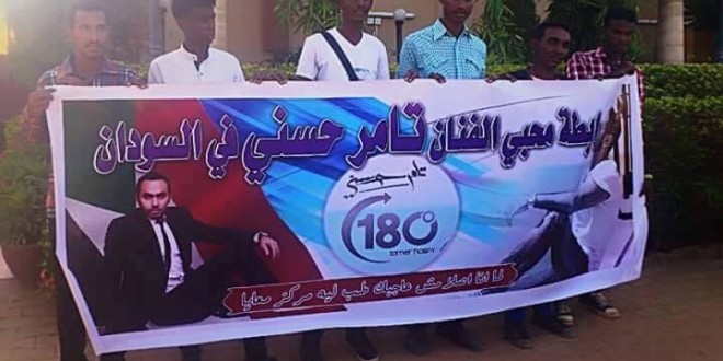 تسبب الفنان تامر حسنى فى احداث أزمة داخل الاراضى السودانية حيث نشر النشطاء فى السودان صورة لمجموعه من شباب السودان حاملين لبانرا كبيرمكتوب عليه رابطة محبى الفنان تامر حسنى بمجرد نشر الصورة على الفيس اشتعلت المعارك الكلامية بين السودانين وبعضهم البعض ، فاحداهم قال