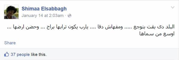 تداول نشطاء على موقع «تويتر» على آخر منشورات كتبتها قتيلة اشتباكات طلعت حرب، الناشطة السياسية شيماء الصباغ، أمينة العمل الجماهيري بأمانة حزب التحالف الشعبي الاشتراكي بالإسكندرية.