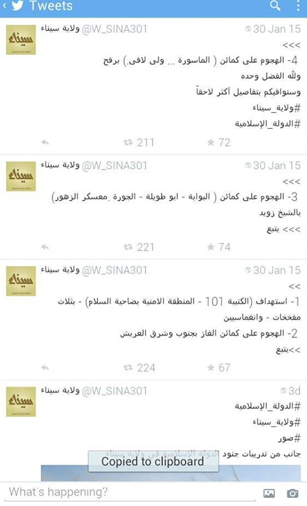 وأوضحت الجماعة، في ثلاث تغريدات عبر حسابها على “تويتر”، استهداف الكتيبة 101 بالمنطقة الأمنية بضاحية السلام عن طريق ثلاثة مفخخات، والهجوم على كمائن الغاز بجنوب وشرق العريش، والهجوم على كمائن البوابة، وهما “أبوطويلة، والجورة، ومعسكر الزهور بالشيخ زويد، والماسورة برفح”.