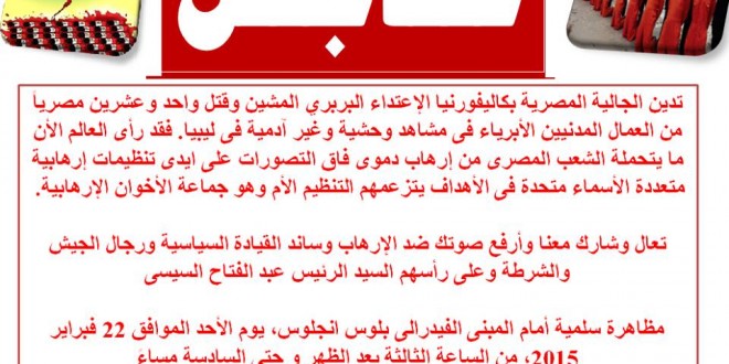 الأهرام الكندي: نشرت الجالية المصرية بيانا لها اعلنت فيه عن عزمها غدا الأحد 22 فبراير القيام بمظاهرة سلمية أمام المبني الفيدرالي بلوس انجلوس، المسيرة ستكون من الساعة الثالثة عصرا وحتي السادسة مساءا.