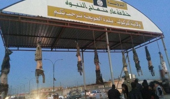 برؤوس عراقيين وسوريين معلقة على بوابة بلدة الحويجة بمدينة كركوك، يتفاخر تنظيم داعش بلافتة مكتوب عليها “الدولة الإسلامية…خلافة على منهاج النبوة”، تليها “ولاية كركوك… بلدة الحويجة ترحب بكم”… ترحيب برائحة الموت والقتل بأجساد معلقة من أرجلها، بينما رؤوسها متدلية في استقبال جثث جديدة تُضاف إلى مسلسل العنف والدموية الذي ينتهجه هذا التنظيم الإرهابي داعش.