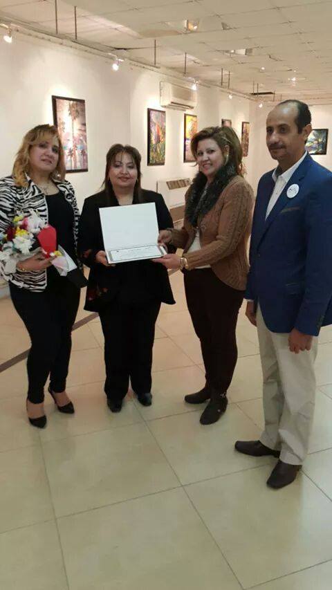 قام اليوم المهندس / هانى فوزى المنسق العام لحركة مصر أحلى بتكريم الدكتورة / مها عبد المنعم أستاذ دكتور قسم التصوير بكلية التربية الفنية جامعة حلوان ، حيث قام فوزى بتسليم شهادة تقدير و باقة ورد كنوع من المشاركة والتقدير لها بمناسبة إفتتاح المعرض ،وأضاف فوزى أن الحركة تهتم بتكريم نماذج نسائية من مختلف التخصصات ايمانا بدورهن الهام في النهوض بالمجتمع . رحبت الدكتورة مها بأعضاء الحركة الذين شاركوا معها حفل إفتتاح المعرض ” واحة النخيل ” الذي عقد بقاعة الشهيد أحمد بسيوني بكلية التربية الفنية بالزمالك.