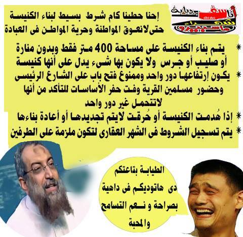 سخرت الصفحة من دواعش السلفية الوهابية والقيادات الامنية بمحافظة المنيا بعد ان وضعوا شروطهم لبناء الكنائس بمجموعة من الهاتشاجات تعبر عن إستيائها بتصرفات الامن وقالت هذه الشروط الهدف منها إزالة الكنائس من مصر بعد حرقها او هدمها وتحويلها الى مساجد طبقاً للدساتير والمبادئ الوهابية بفضل راس المال الوهابى .